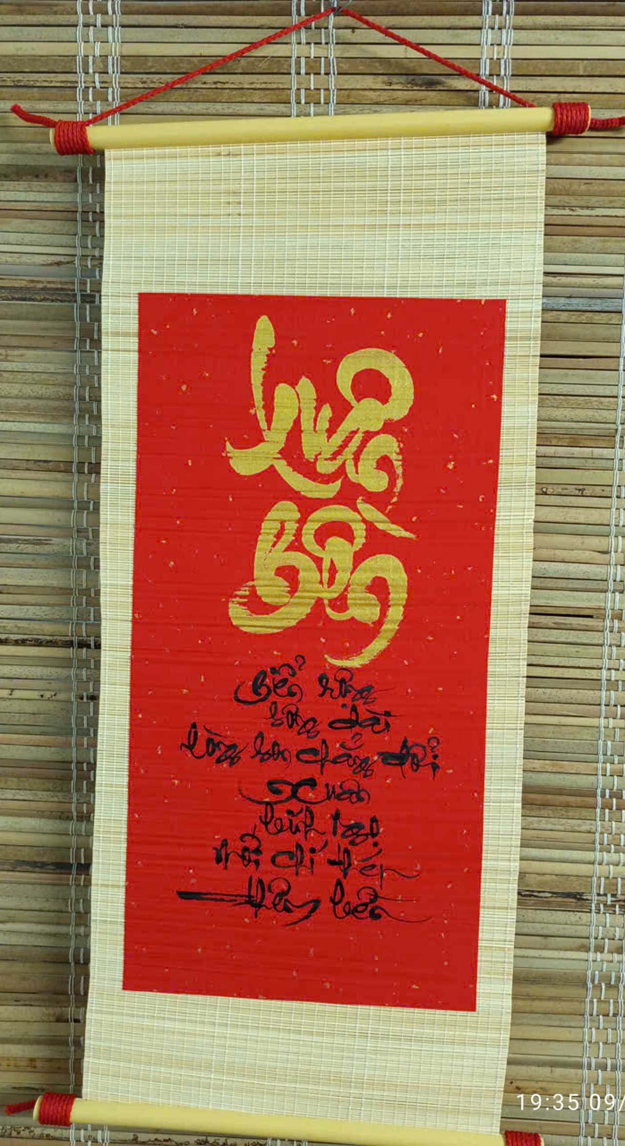 - Liễn mành tre được gắn dây treo đỏ hợp phong thủy.