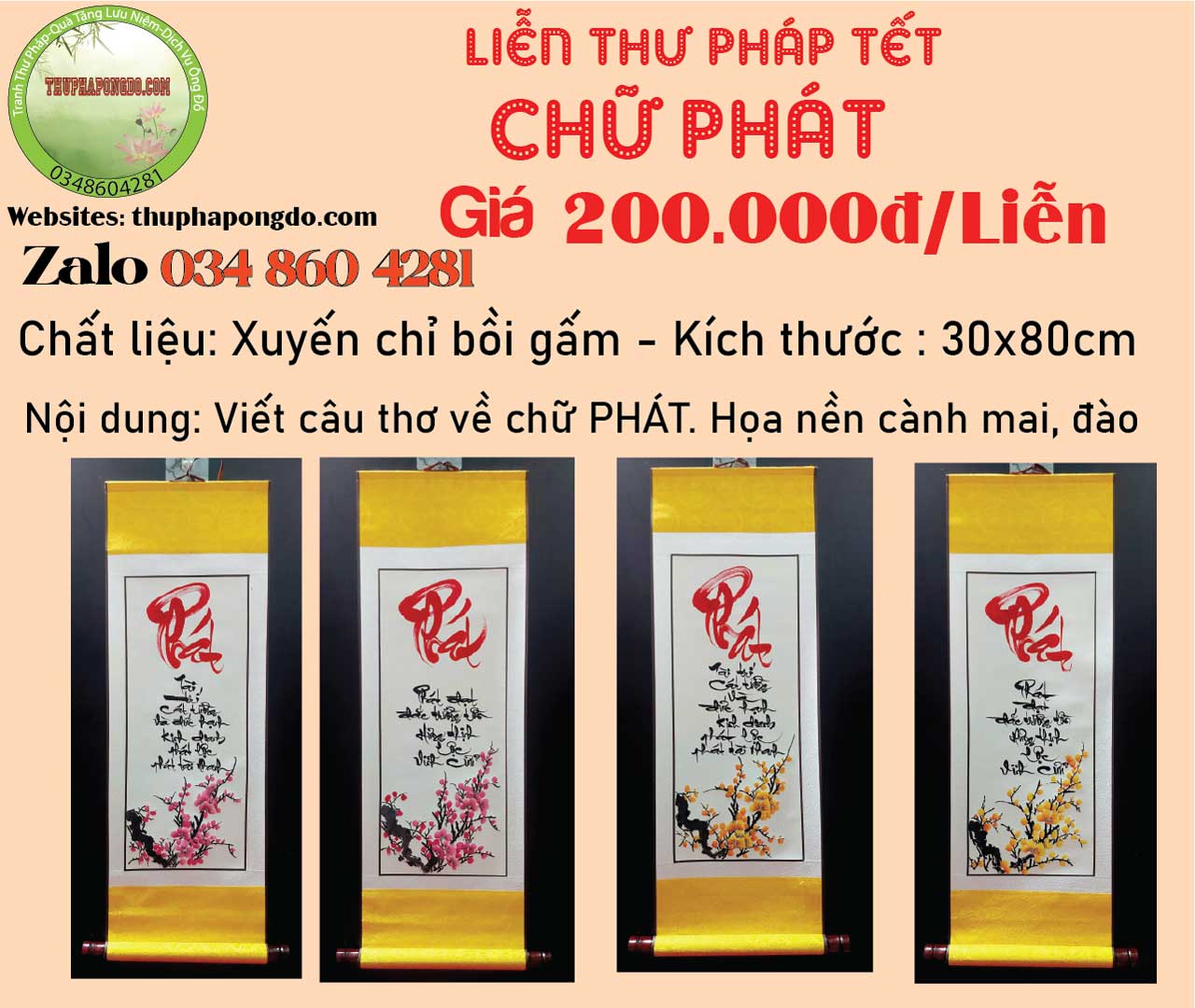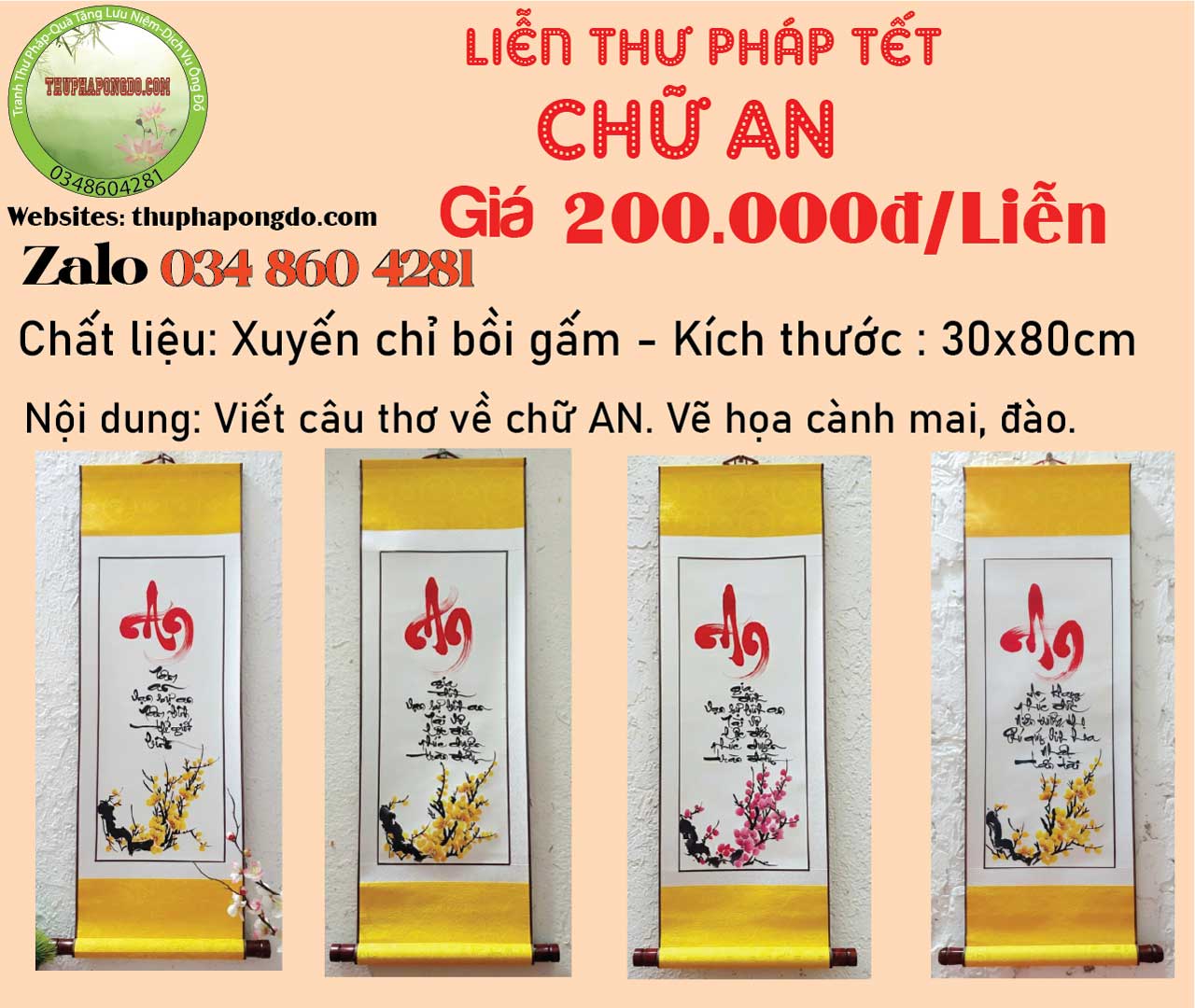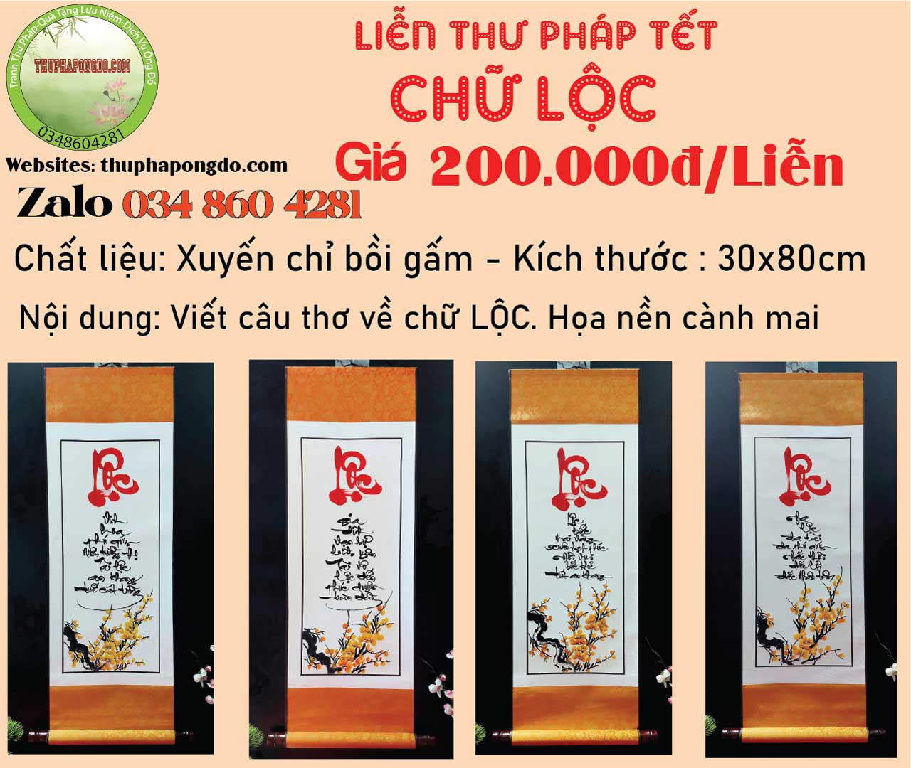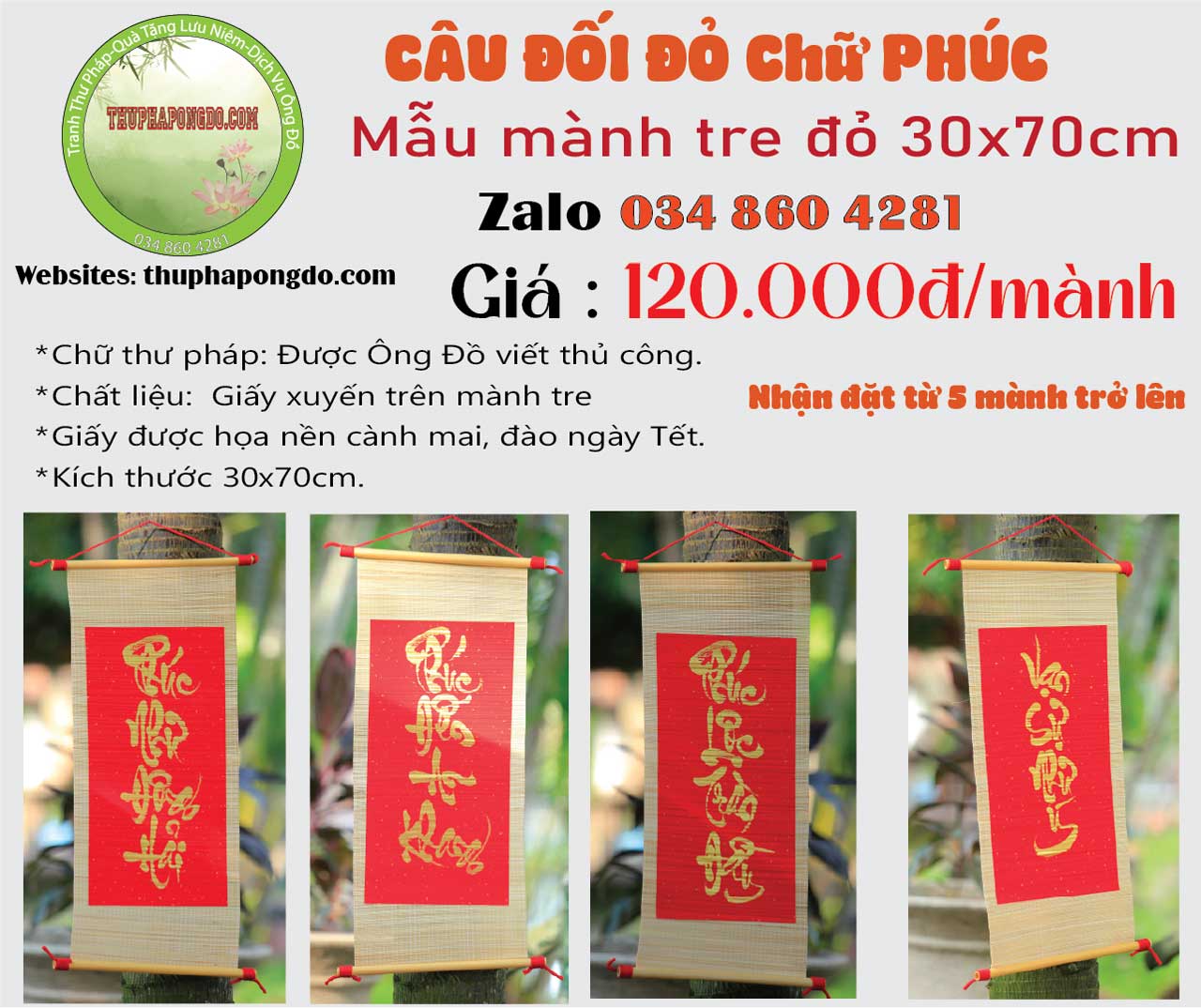60x120cm | 600k/mành | Viết chữ Xuân, Tết, Phúc, Lộc, Bình An.