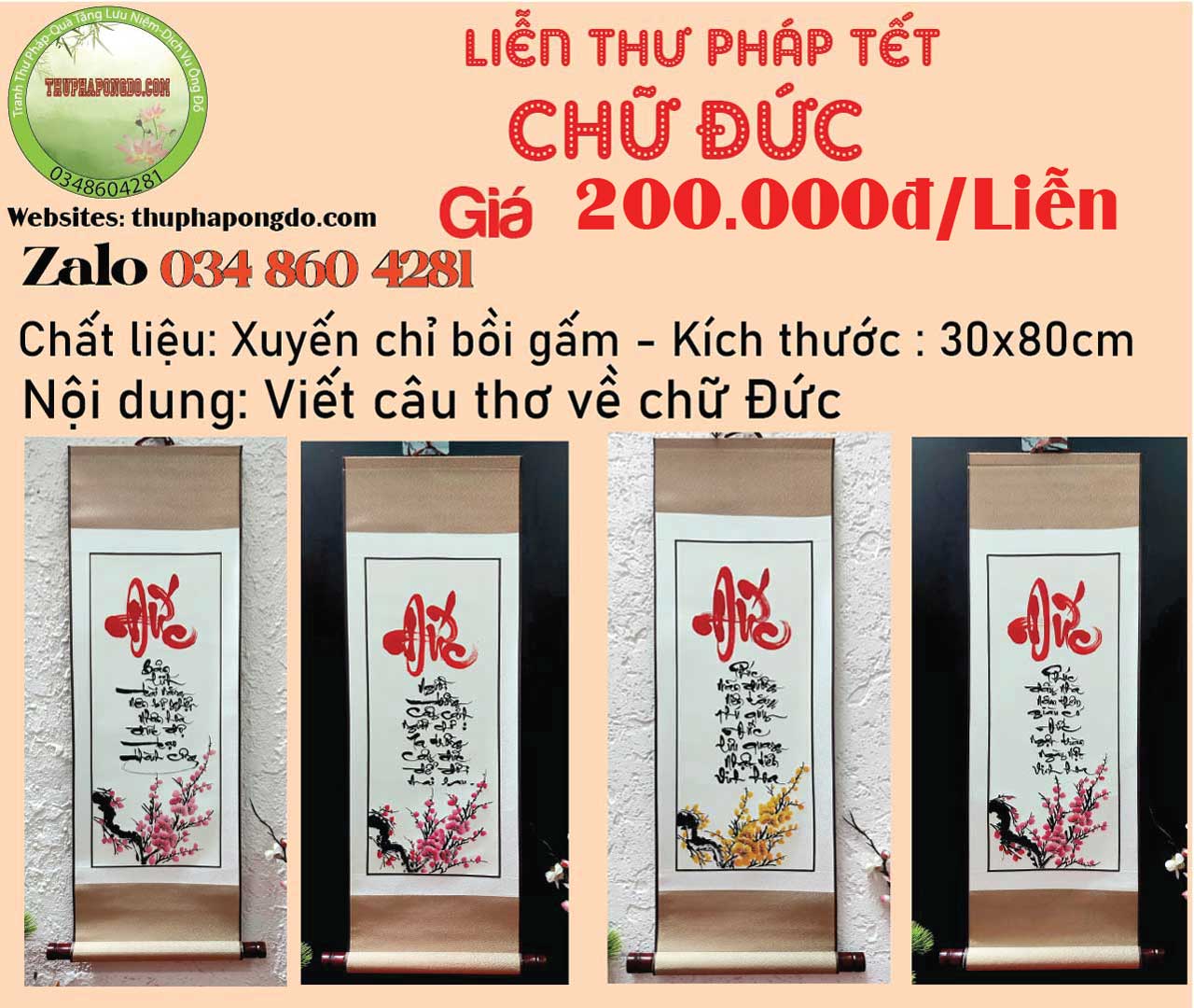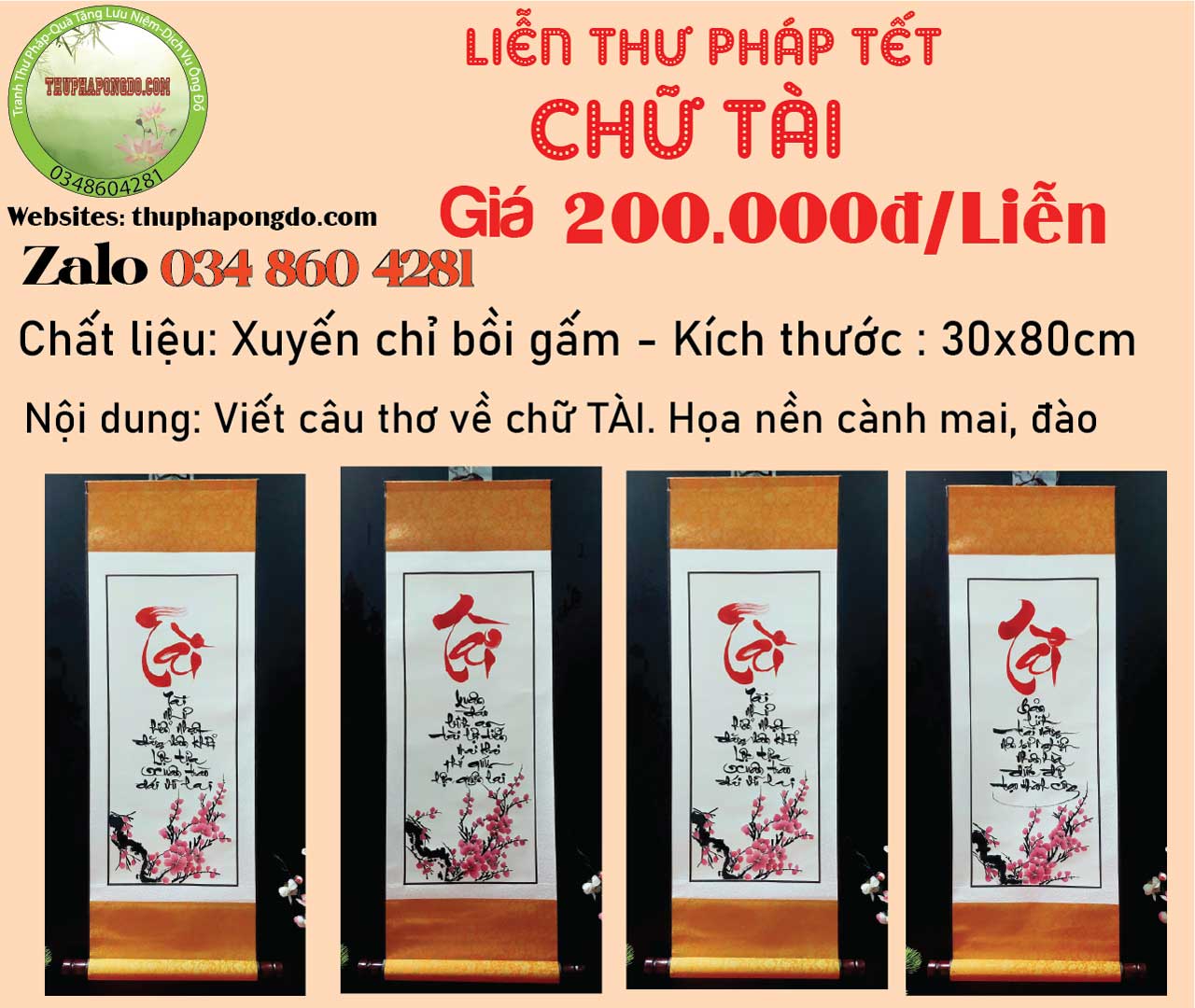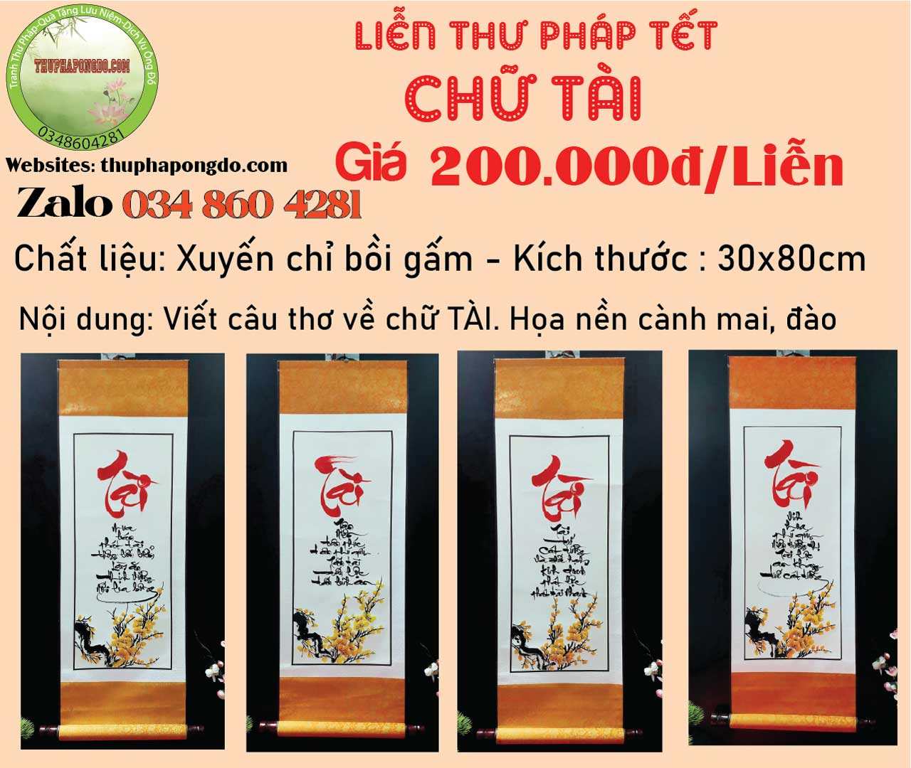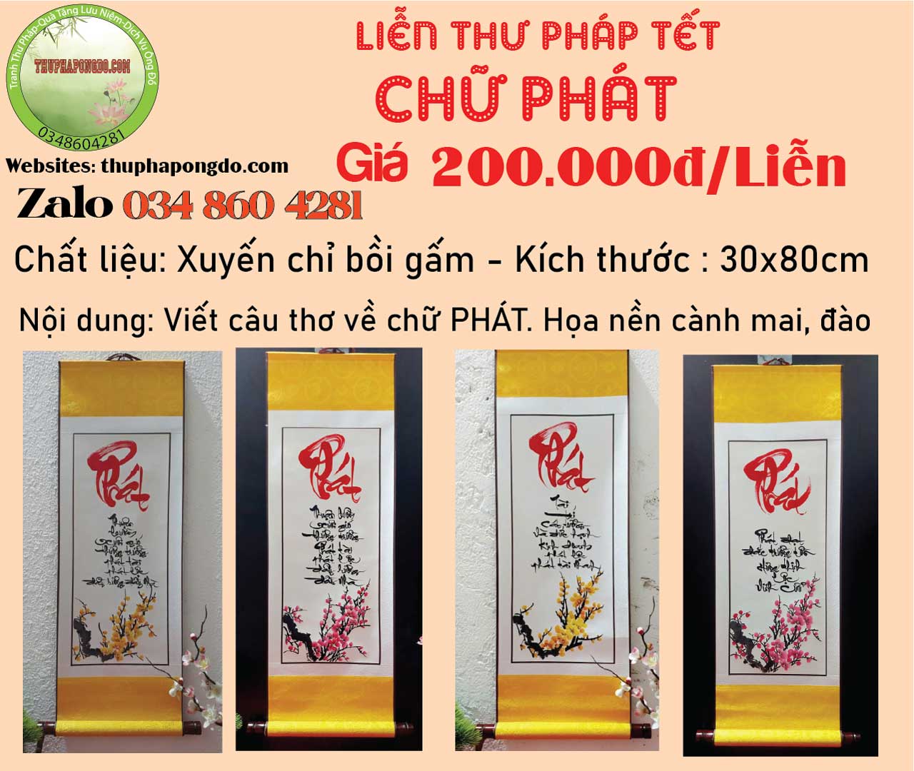 60x120cm | 600k/mành | Viết chữ Xuân, Tết, Phúc, Lộc, Bình An.