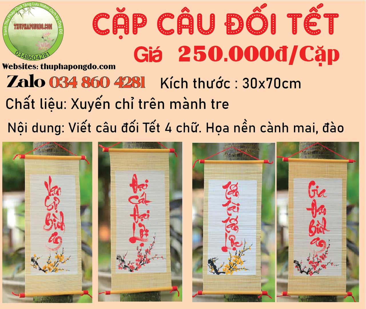 - Kích thước liễn mành tre thường sử dụng là 30x70cm. Có dùng để viết câu đối 4 chữ hoặc câu thơ ý nghĩa ngày Tết.
