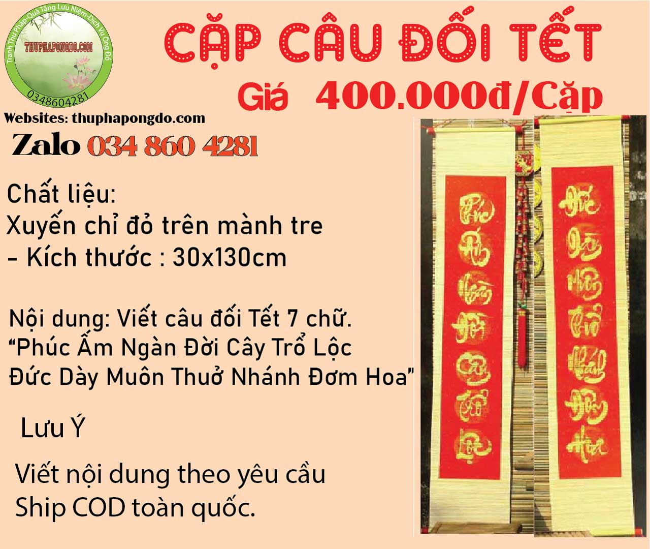 | 20x130cm | 400k/cặp | Cặp câu đối 7 chữ | |