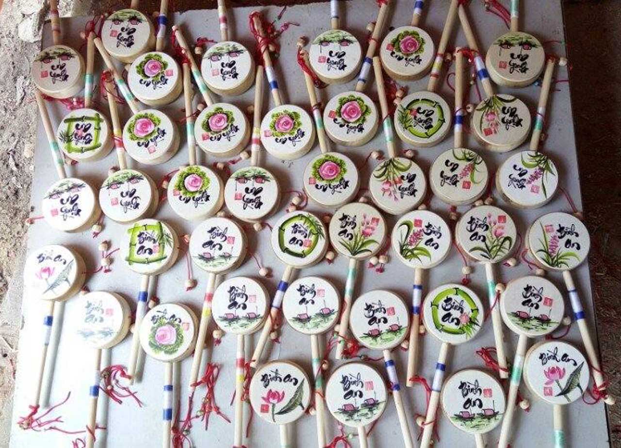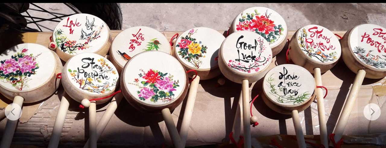 Trống lắc (trống bỏi) viết thư pháp– món đồ chơi Tết dân gian gợi nhớ tuổi thơ. Ông đồ viết chữ thư pháp lên trống lắc. Món quà hấp dẫn trẻ con và người lớn.