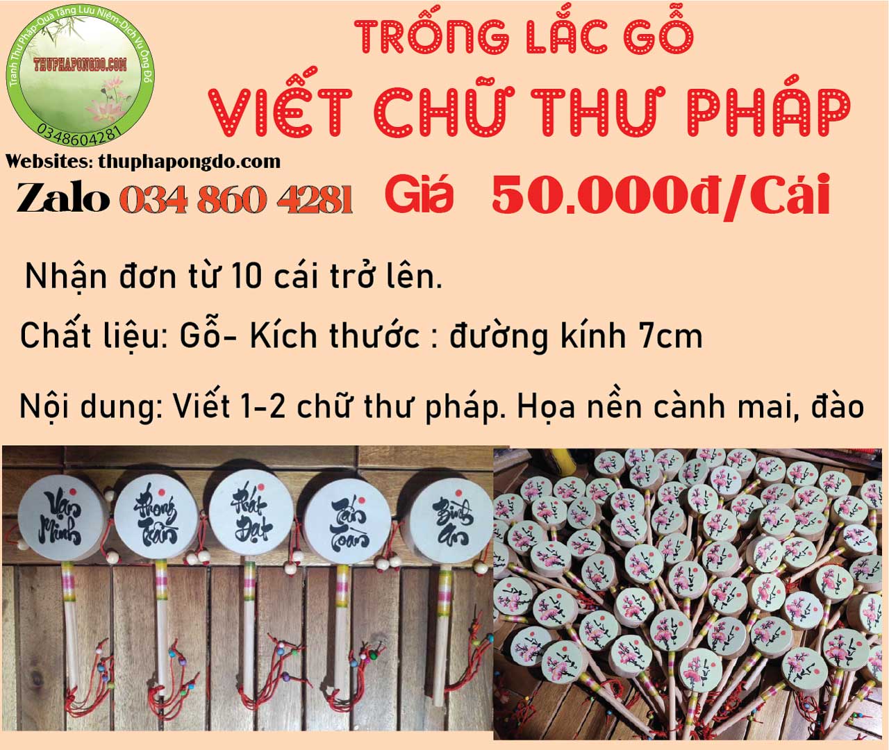 Thuphapongdo.com nhận cung cấp, bán trống lắc, móc khóa gỗ, tranh gỗ tấm, cốc tre, quạt,… viết thư pháp theo yêu cầu